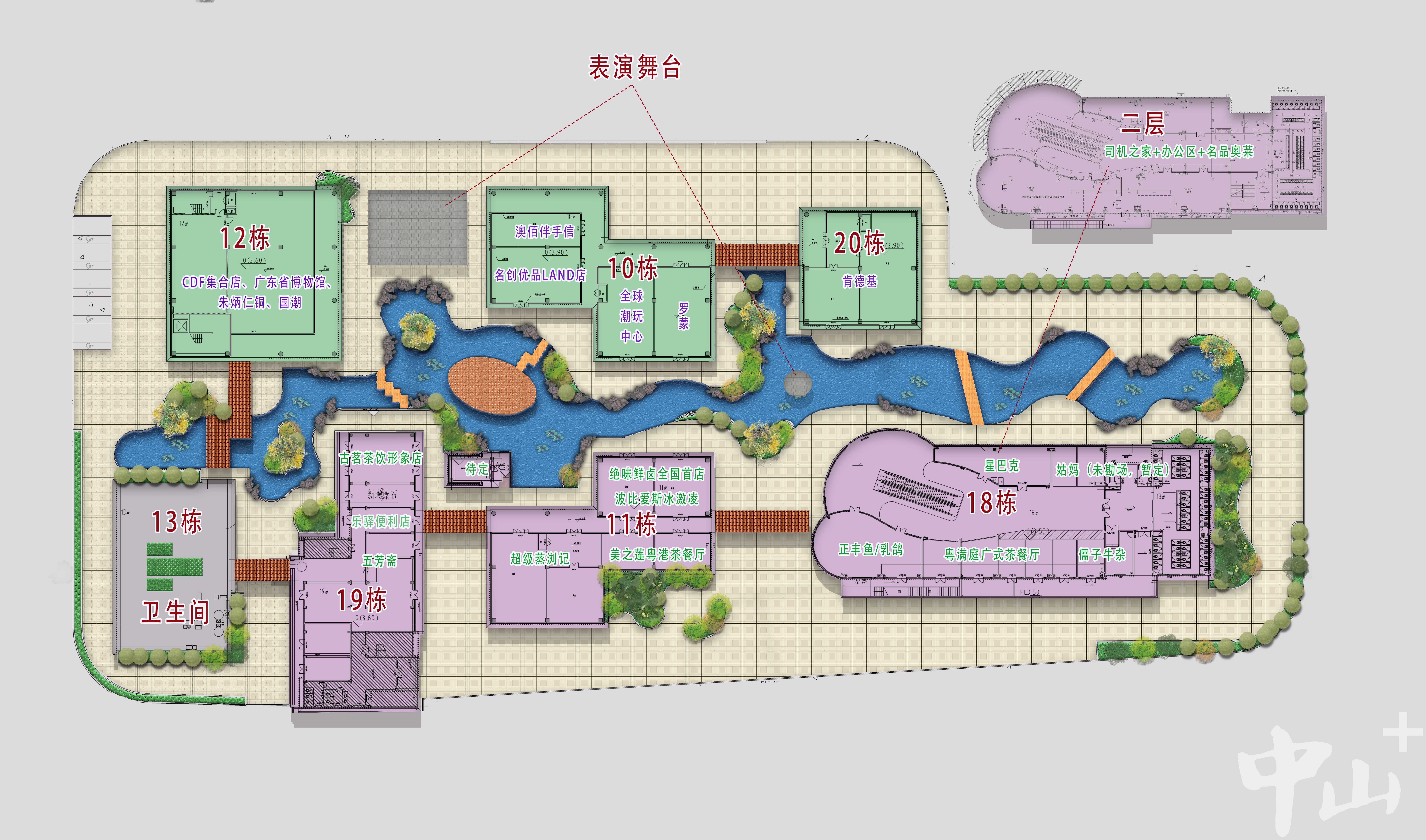 中山服務(wù)區(qū)總體布局提取中山嶺南水鄉(xiāng)“流水”和“聚落”的元素,以“嶺南水鄉(xiāng)+大美中山”為主題。從設(shè)計圖上看,中山服務(wù)區(qū)打破建筑與景觀的邊界,形成室內(nèi)商業(yè)、戶外水街、天橋串聯(lián)3條游覽動線,讓司乘在停留間隙就能沉浸式體驗嶺南文化。