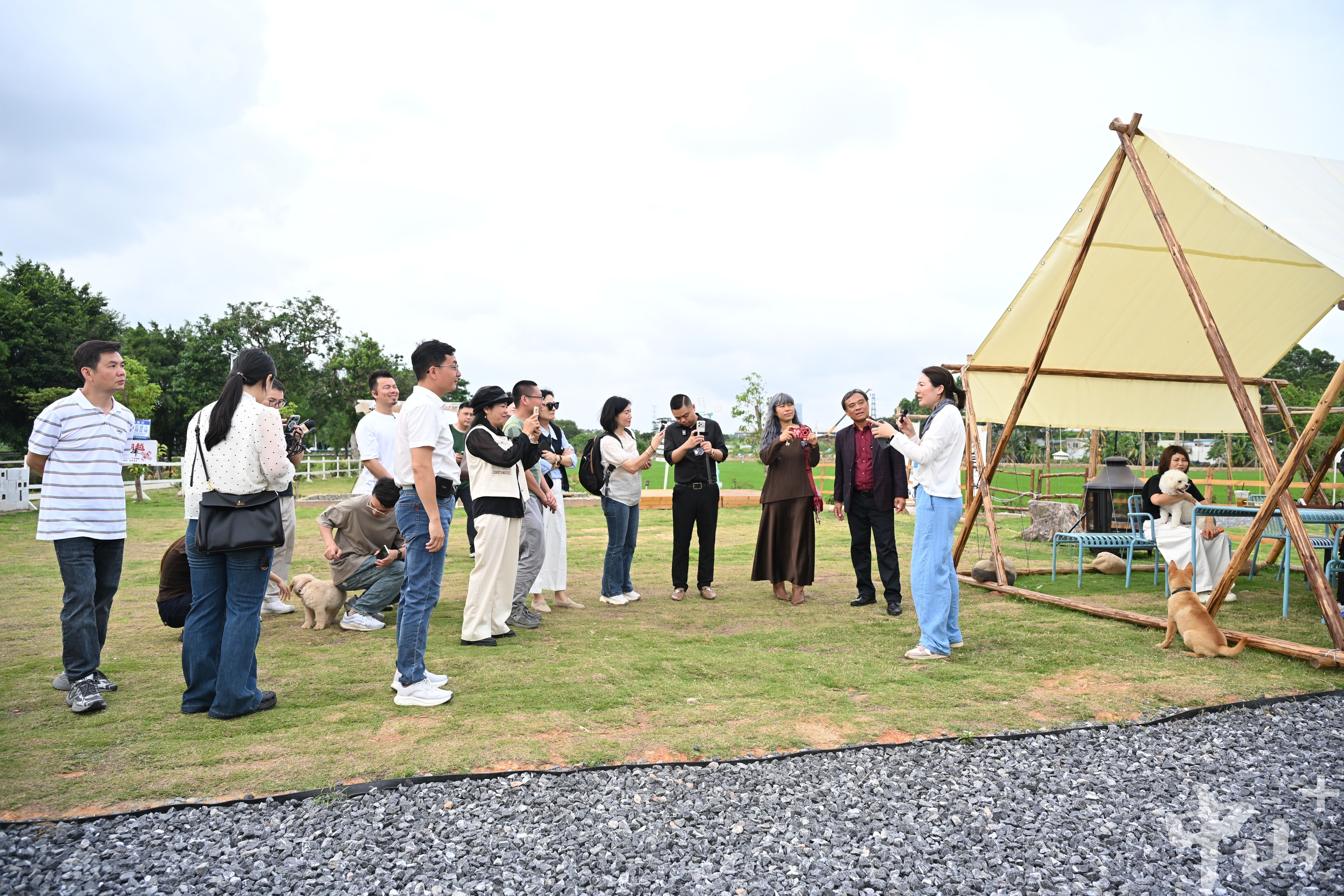 告別古村,采風團來到火炬高新區(qū)濠二小區(qū)。經過系統(tǒng)綜合治理,昔日黑臭的濠頭涌蛻變?yōu)樗灏毒G的生態(tài)長廊,沿岸繁花競放,網紅營地、特色餐飲店等業(yè)態(tài)人氣漸旺。采風團沿河漫步,走進僑樓咖啡小院、聚匣里新中式茶館、云邊田院,沿途取景記錄、聆聽蝶變故事,與當地村民親切交流,現場錄制推介視頻,以鮮活的網絡傳播形式,展現“百千萬工程”落地成效與水岸經濟蓬勃活力。