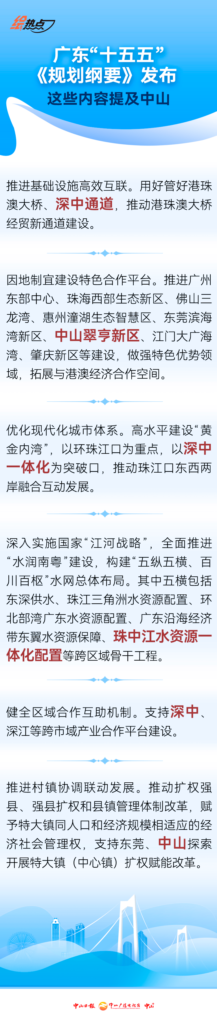 《規(guī)劃綱要》的其他章節(jié)也有多處涉及中山。在第八章重點(diǎn)領(lǐng)域改革部分,提到建設(shè)中山市省珠江口東西兩岸融合發(fā)展改革創(chuàng)新實(shí)驗(yàn)區(qū);在第十一章第三節(jié)建設(shè)現(xiàn)代化嶺南和美鄉(xiāng)村部分,提到推動(dòng)村鎮(zhèn)協(xié)調(diào)聯(lián)動(dòng)發(fā)展,支持東莞、中山探索開展特大鎮(zhèn)(中心鎮(zhèn))擴(kuò)權(quán)賦能改革等內(nèi)容。