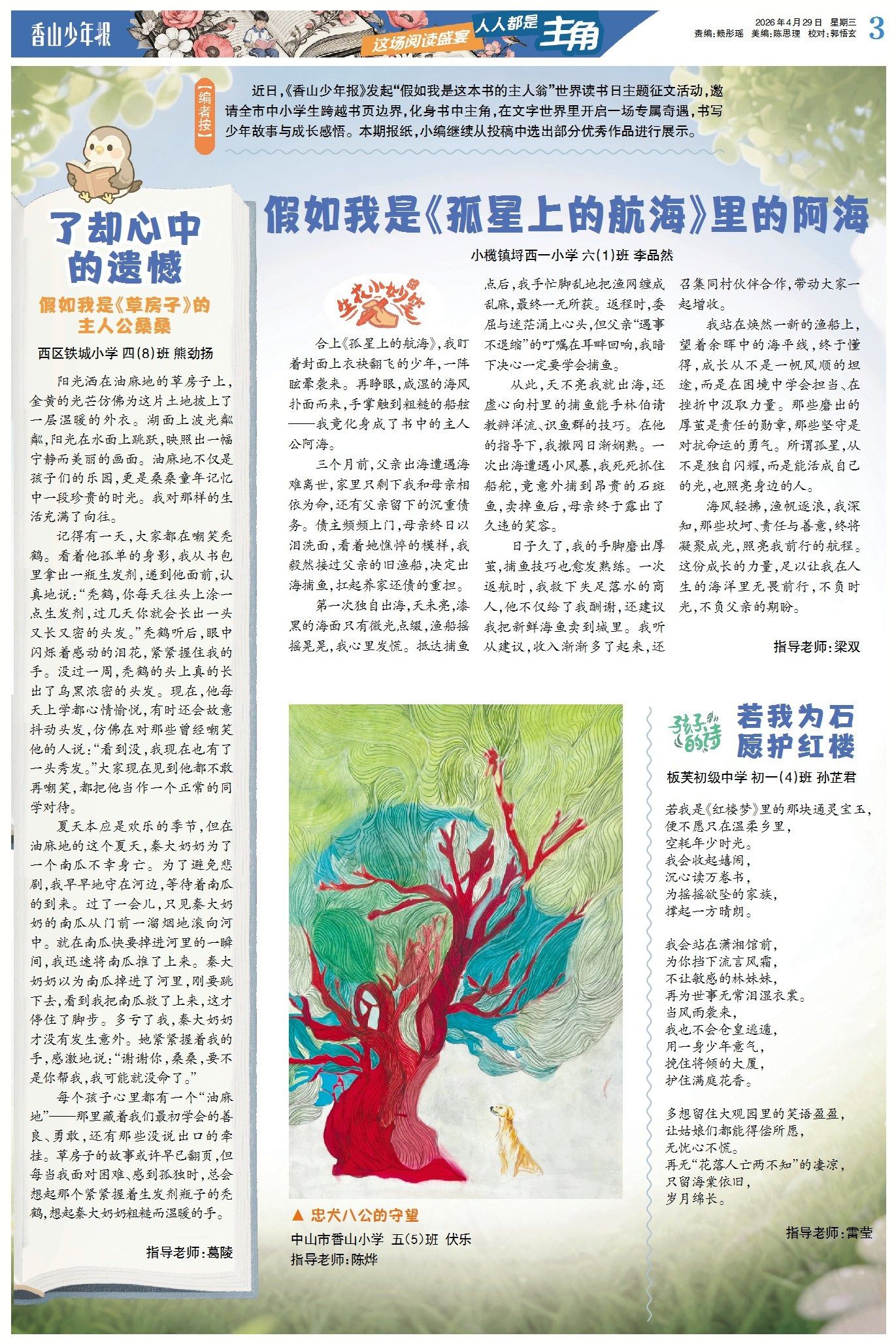 近日,《香山少年報(bào)》發(fā)起“假如我是這本書的主人翁”世界讀書日主題征文活動(dòng),邀請(qǐng)全市中小學(xué)生跨越書頁邊界,化身書中主角,在文字世界里開啟一場(chǎng)專屬奇遇,書寫少年故事與成長(zhǎng)感悟。本期報(bào)紙,小編繼續(xù)從投稿中選出部分優(yōu)秀作品進(jìn)行展示。(→點(diǎn)擊查看詳情)