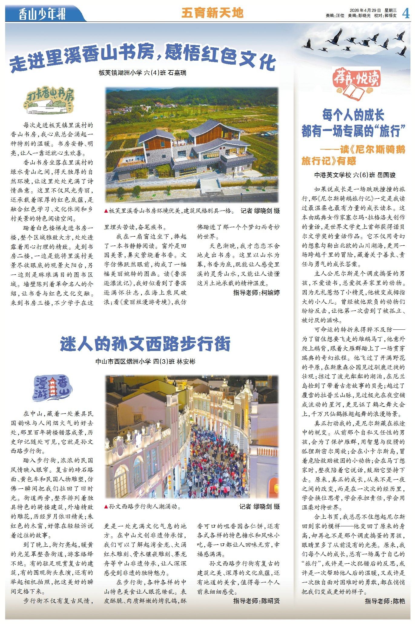 本期《五育新天地》,同學(xué)們用文字記錄了豐富的成長(zhǎng)足跡:有人走進(jìn)里溪香山書房,在書香與紅色文化交融的氛圍里感悟初心;有人漫步孫文西步行街,在復(fù)古騎樓與煙火市井間感受中山魅力;還有人分享了自己閱讀《尼爾斯騎鵝旅行記》的感悟,在尼爾斯的奇幻旅程中讀懂成長(zhǎng)的意義。(→點(diǎn)擊查看詳情)
