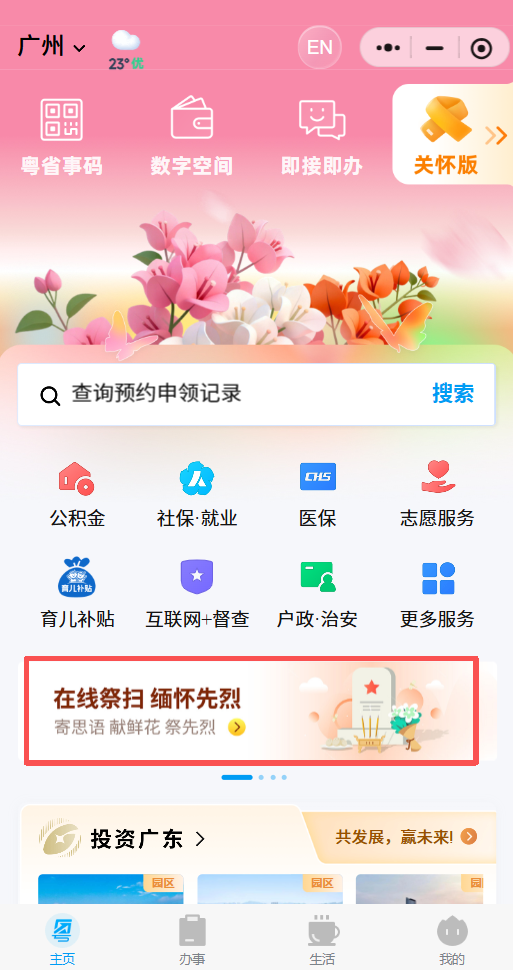 1、進(jìn)入粵省事后,在首頁往下滑動至熱門服務(wù)下方的“推廣入口”區(qū)域,然后左右滑動,可見“在線祭掃 緬懷先烈”的圖片入口?;蛟谒阉鳈谳斎?strong>“英烈在線祭掃”進(jìn)入。