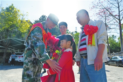 葉陽浩、胡家威兩名準(zhǔn)新兵身披“光榮入伍”的紅色綬帶和大紅花昂首挺胸站在太陽下,新兵家屬前來歡送?!瓣柡频奶檬迨?、外公和叔公都曾應(yīng)征入伍,他能進(jìn)部隊(duì)得到鍛煉,我們作為他的父母感到很光榮、很幸福。”葉陽浩的父母胸戴“光榮家屬”的大紅花,激動(dòng)地說。