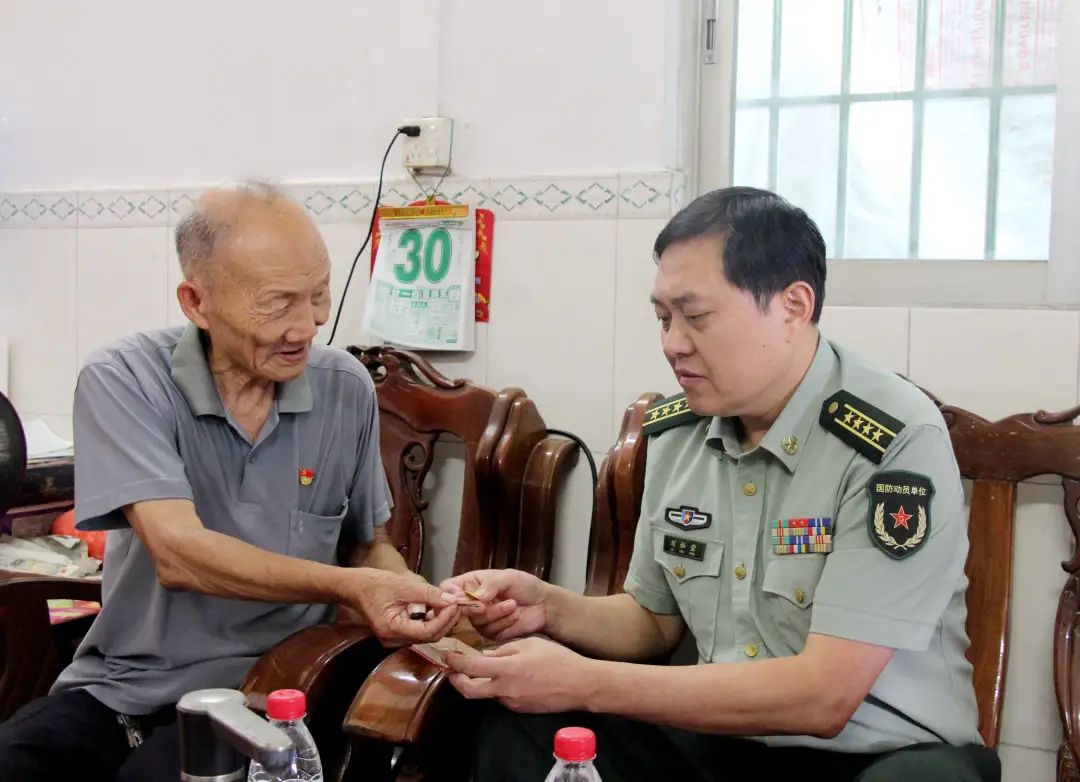 在“八一”建軍節(jié)即將到來之際,7月30日上午,市委常委、中山軍分區(qū)政委劉燦瑩來到橫欄鎮(zhèn),走訪慰問部分退役軍人,為他們送去黨和政府的親切關(guān)懷,祝福他們建軍節(jié)快樂、身體健康、家庭幸福。鎮(zhèn)領(lǐng)導林培華、葉劍榮、高桂冰等陪同慰問。 周七友,今年80歲,是橫欄鎮(zhèn)橫東村一名有著54年黨齡的退伍老兵。1959年,18歲的周七友參軍入伍,成為一名軍人。1968年,周七友光榮退伍。 1959年到1968年,周七友獲得了許多獎項與勛章,這些勛章他都悉心保存,非常有意義和價值。 “這幾枚是'五好戰(zhàn)士'稱號徽章。當年戰(zhàn)士們積極響應(yīng)黨中央號召,爭當'五好戰(zhàn)士'。'五好'是指:政治思想好,三八作風好,軍事技術(shù)好,完成任務(wù)好,鍛煉身體好”,多年過去了,周七友還清楚記得“五好”的具體內(nèi)容?!斑€有這一枚是‘技術(shù)能手’稱號徽章,當時我能夠熟練地拆裝一整部車,所以就獲得了這枚‘技術(shù)能手’稱號徽章。這枚徽章我們一個班只有我獲得了。”