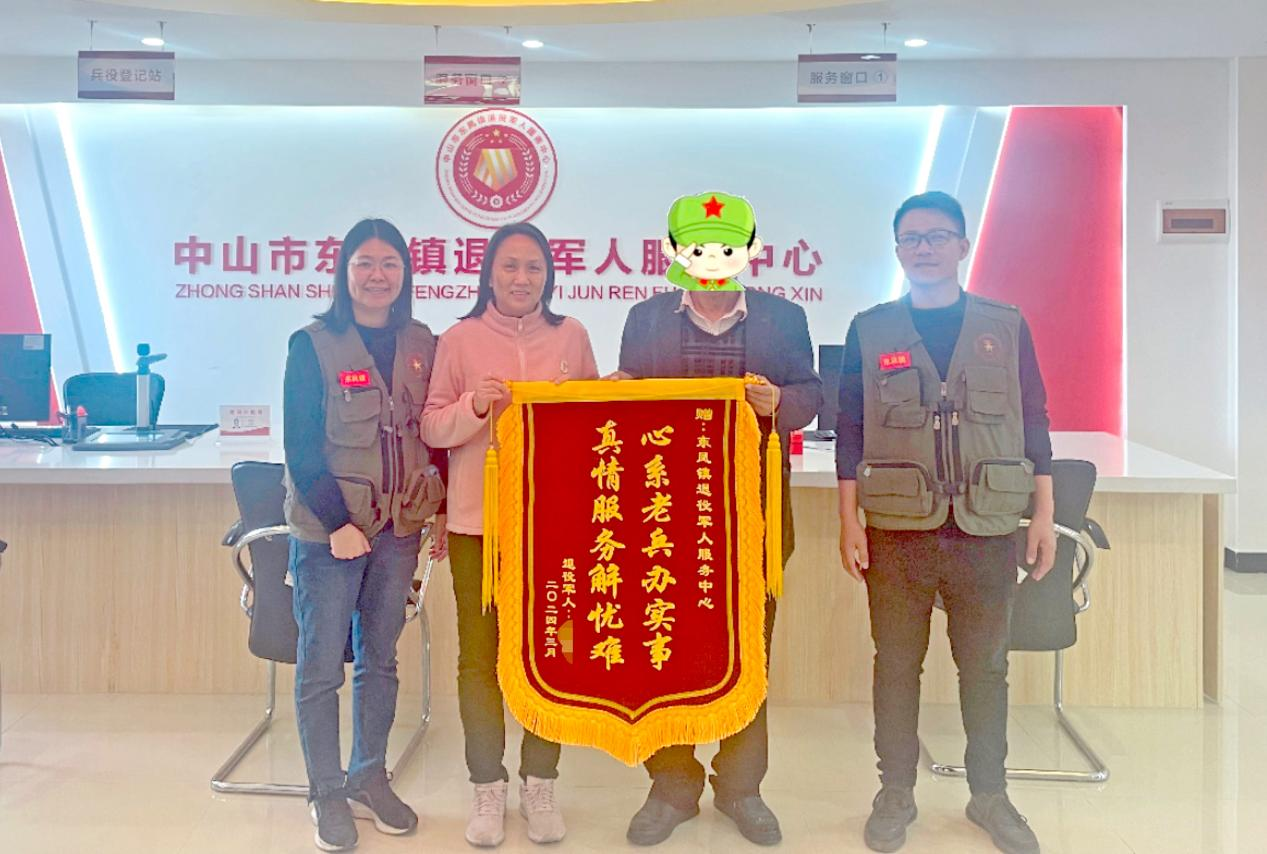3月19日,中山市東鳳鎮(zhèn)小瀝社區(qū)退役軍人朱叔懷著感激之情,將一面印有“心系老兵辦實事,真情服務(wù)解憂難”的錦旗送到東鳳鎮(zhèn)退役軍人服務(wù)中心,感謝該中心幫助其分別成功申請到廣東省應(yīng)急救助資金和中山市臨時困難補(bǔ)助,解決了他的燃眉之急,緩解了家庭困難。  退役軍人朱叔將一面印有“心系老兵辦實事,真情服務(wù)解憂難”的錦旗送到東鳳鎮(zhèn)退役軍人服務(wù)中心。通訊員供圖