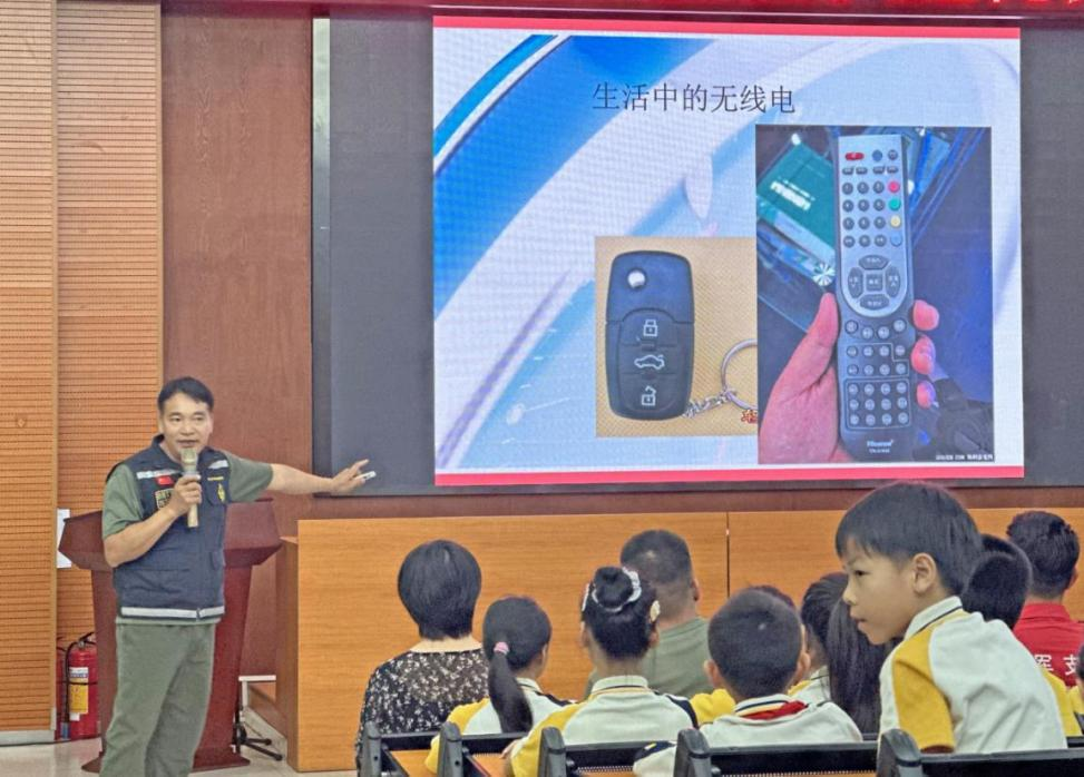 西區(qū)中心小學(xué)內(nèi),省、市最美退役軍人結(jié)合自身經(jīng)歷,講述軍人忠誠(chéng)擔(dān)當(dāng)與“??招l(wèi)士”王偉等英雄故事。隨后,無線電運(yùn)動(dòng)協(xié)會(huì)帶來一堂科普課,學(xué)生們嘗試摩斯密碼收發(fā)操作,在“滴答”聲中感受科技安全的重要性。