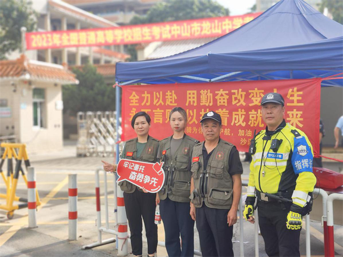 三鄉(xiāng)鎮(zhèn)退役軍人志愿者和民兵在桂山中學考場提供安保服務。