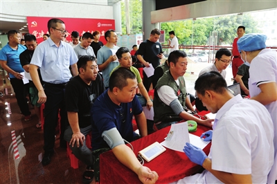 我市退役軍人踴躍報名參加無償獻(xiàn)血活動,大家正在接受獻(xiàn)血前血壓測量。記者 王云 攝