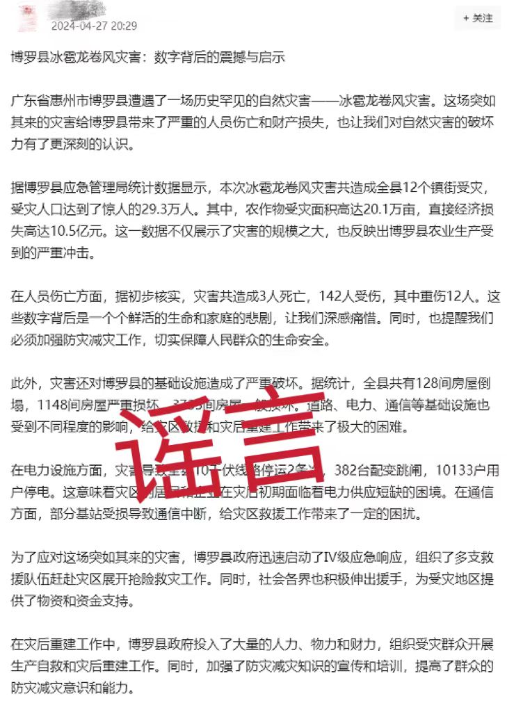 4月27日,博羅公安在工作中發(fā)現(xiàn),有網(wǎng)民在某平臺發(fā)布帖文,稱“博羅縣遭遇一場歷史罕見的自然災(zāi)害-冰雹龍卷風(fēng)”“災(zāi)害造成3人死亡,142人受傷,其中重傷12人”。
