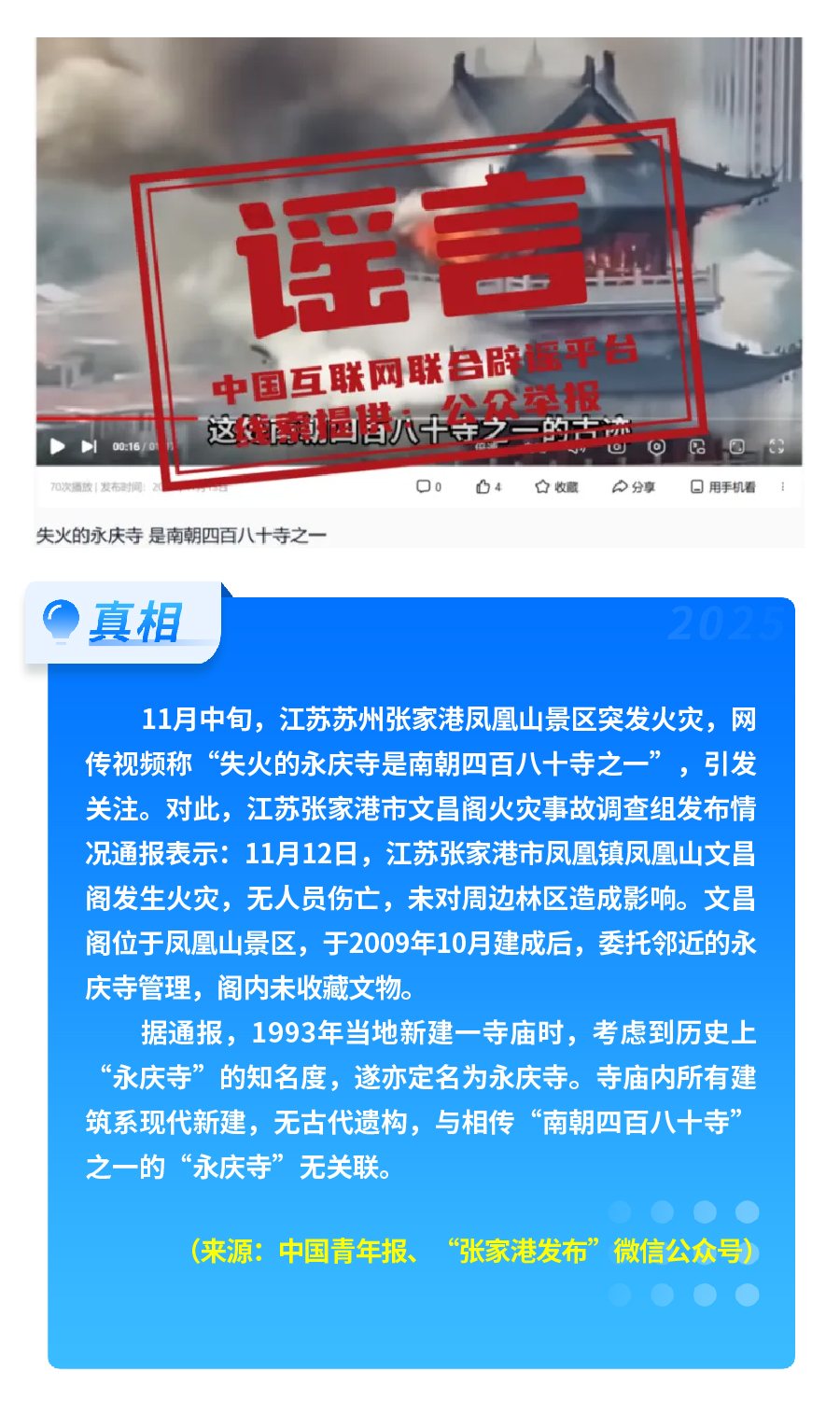 社會(huì)熱點(diǎn)事件被歪曲蹭炒。首屆“蘇超”聯(lián)賽泰州隊(duì)奪冠后,“冠軍獲五十萬(wàn)獎(jiǎng)金、城市地圖放大字號(hào)”等謠言流傳,以夸張信息博眼球、引流量;江蘇張家港鳳凰山景區(qū)火災(zāi)后,“‘南朝四百八十寺之一’被燒”的謠言引發(fā)熱議,通報(bào)顯示失火建筑為2009年新建,與歷史上的南朝寺廟無(wú)關(guān)聯(lián)。