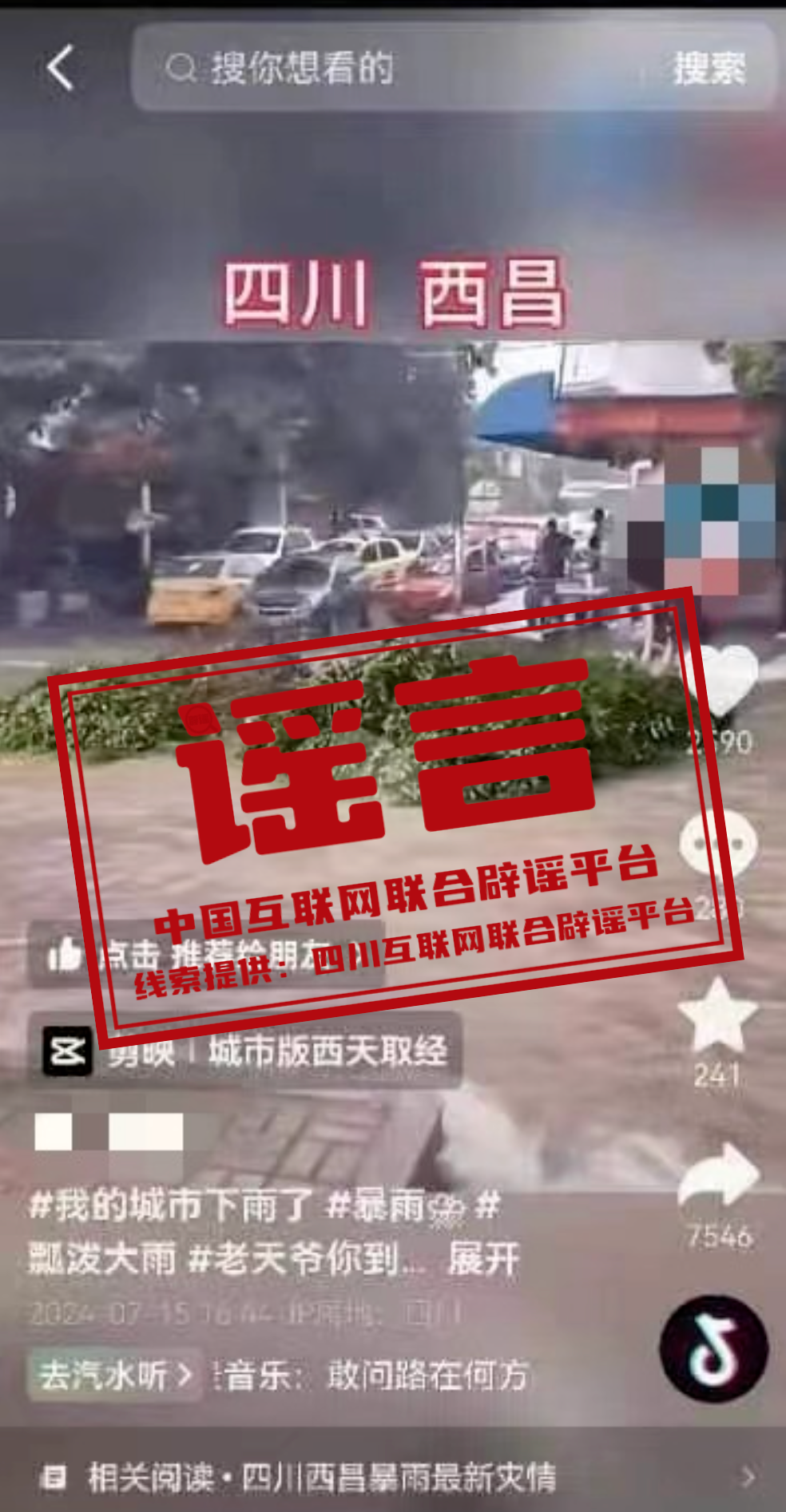 近日,有網(wǎng)民發(fā)布一條視頻,顯示兩人利用被吹斷的大樹枝在街道上乘汛漂流,并在視頻上方標(biāo)注了“四川西昌”的字樣,引發(fā)網(wǎng)民關(guān)注。經(jīng)調(diào)查,該視頻系網(wǎng)民蔡某為博眼球、吸流量,利用短視頻編輯軟件上的模板剪輯而成,并在短視頻平臺(tái)進(jìn)行傳播,造成不良社會(huì)影響。當(dāng)?shù)毓矙C(jī)關(guān)依法對(duì)其進(jìn)行處罰,并已責(zé)令其刪除謠言信息。(來源:四川互聯(lián)網(wǎng)舉報(bào)辟謠平臺(tái))