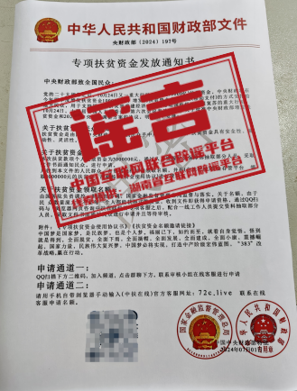真相:近日,湖南一居民收到不明快遞,內(nèi)有一封以“國(guó)家金融監(jiān)督管理總局”和“中華人民共和國(guó)財(cái)政部”名義發(fā)布的《專項(xiàng)扶貧資金發(fā)放通知書(shū)》。該文件稱“中央財(cái)政將在今年四季度增發(fā)扶貧資金10000億元,凡收到本文件的人民群眾,有資格通過(guò)QQ掃碼進(jìn)入群聊,聯(lián)系在線客服,或登錄‘中扶在線’平臺(tái)聯(lián)系客服,申請(qǐng)300萬(wàn)扶貧資金”。